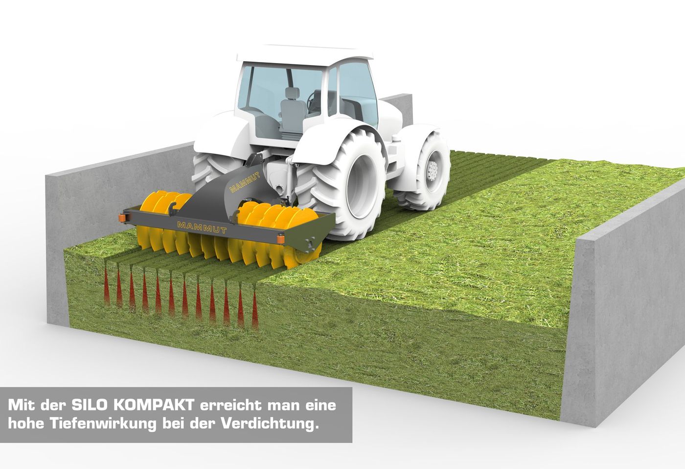 Los rodillos de silo MAMMUT de la serie SILO KOMPAKT no solo facilitan el trabajo de rodillo, sino que también aumentan principalmente el efecto de compactación en el silo, mejorando así la calidad del silo.