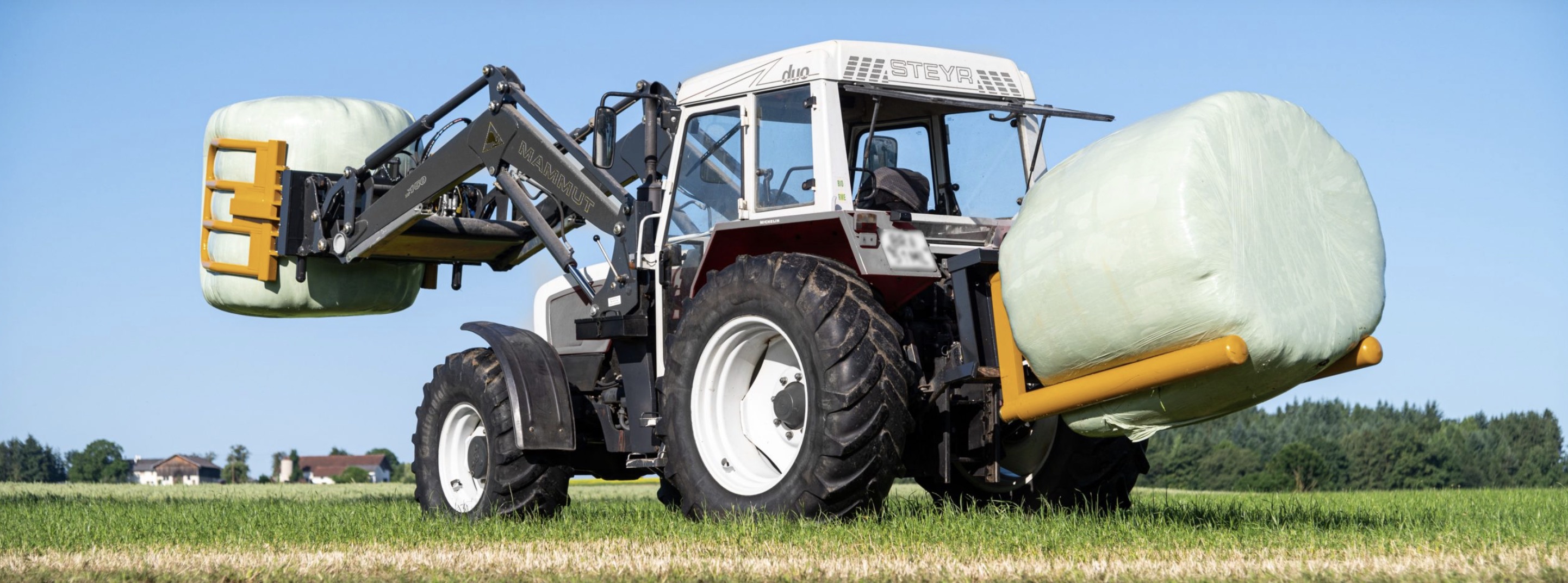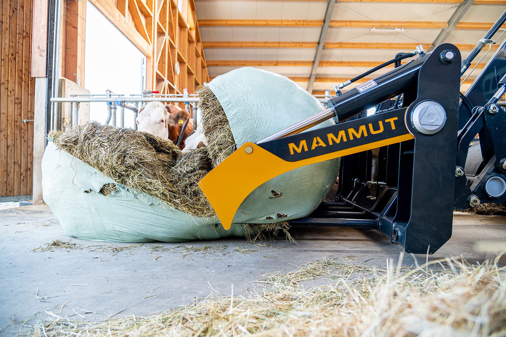 Una amplia gama de dispositivos de transporte de fardos de MAMMUT también asegura que la calidad de la alimentación se mantenga. Cuando se trata de suministrar forraje a partir de fardos de silo, el objetivo principal es facilitar el trabajo: las tijeras de fardos MAMMUT pueden cortar fardos redondos de forma rápida y sin esfuerzo, distribuyéndolos en la mesa de alimentación o para su posterior procesamiento en el mezclador de forraje de manera ideal.